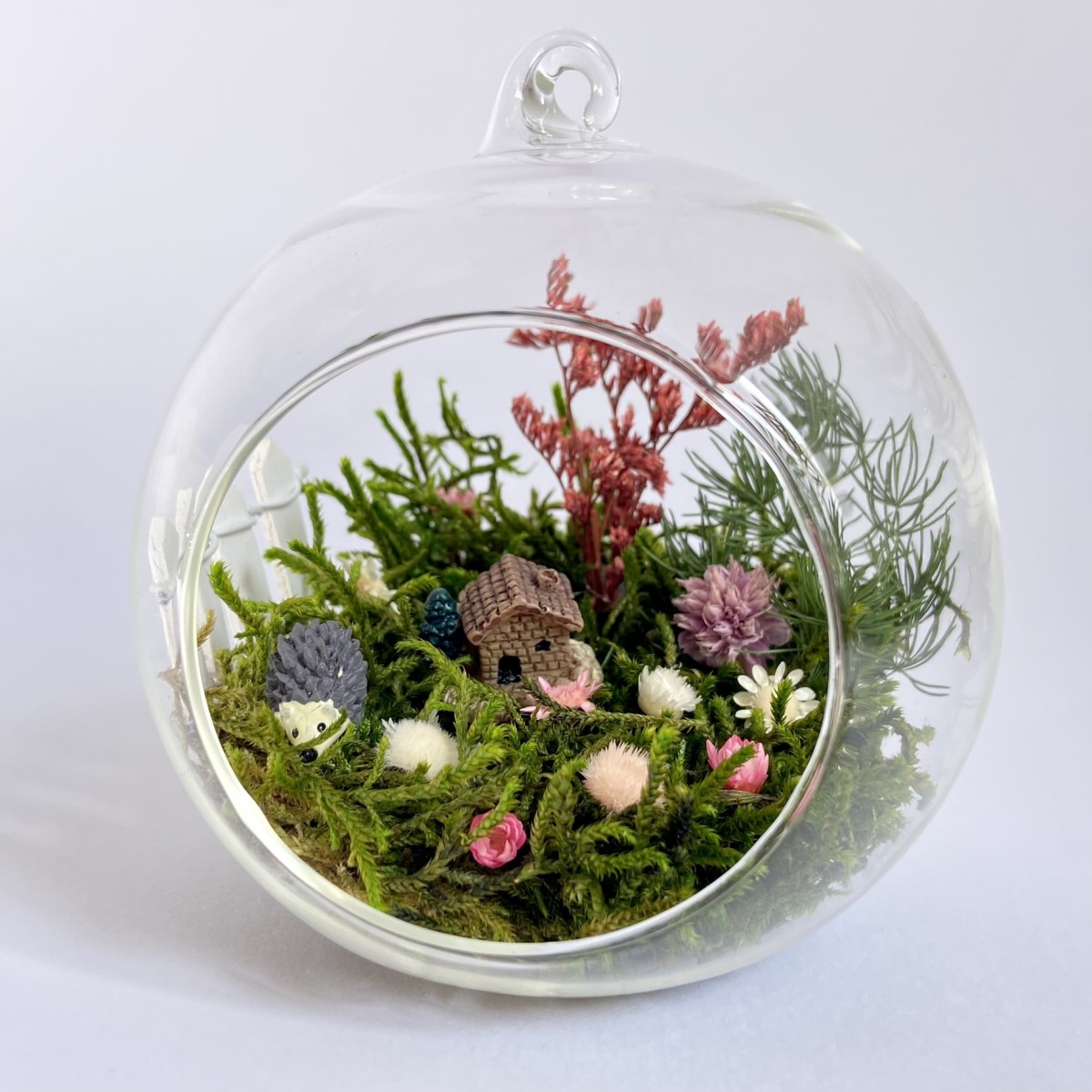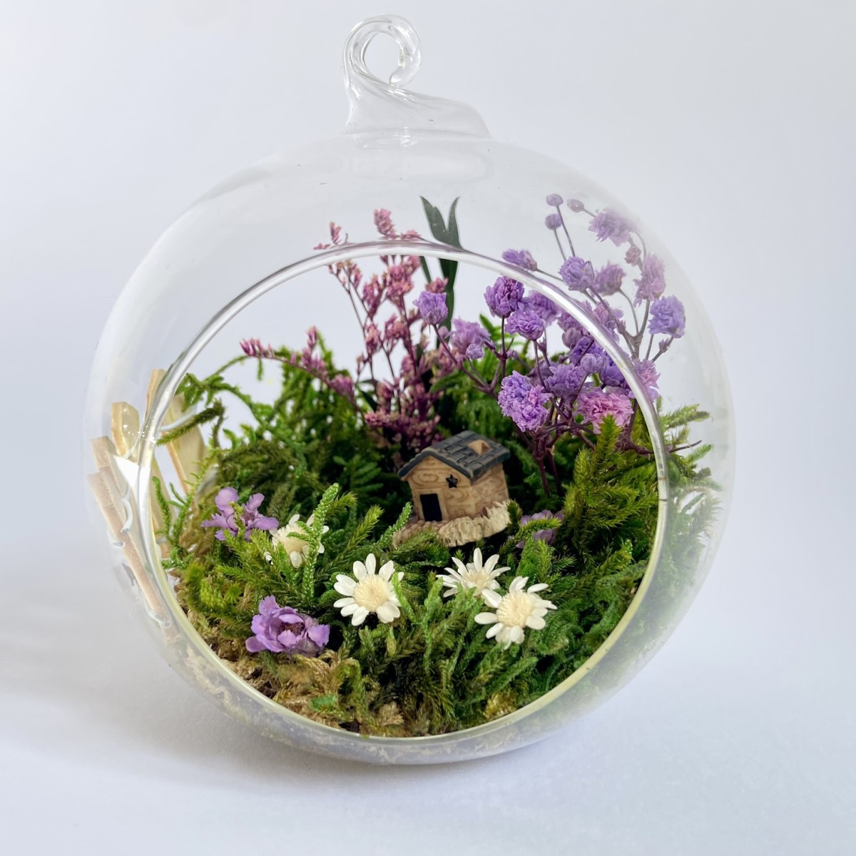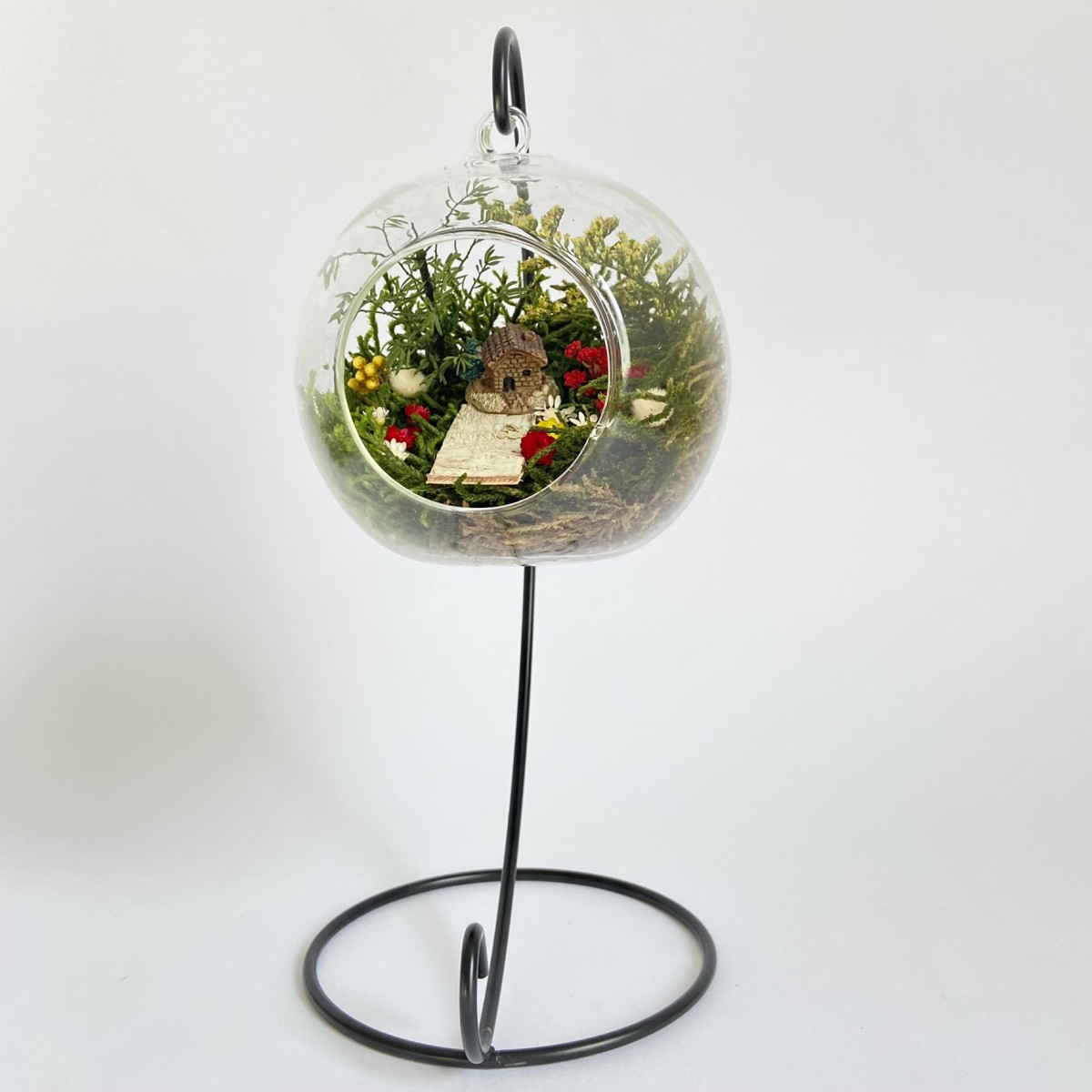 Peisajul din interiorul globului este realizat cu elemente naturale, muschi, plante si flori stabilizate si uscate si figurine din rasina. Plantele nu necesita in grijire si nu se deterioreaza, deoarece isi pastreaza culoarea si forma pentru o perioada de aproximativ 3-5 ani.