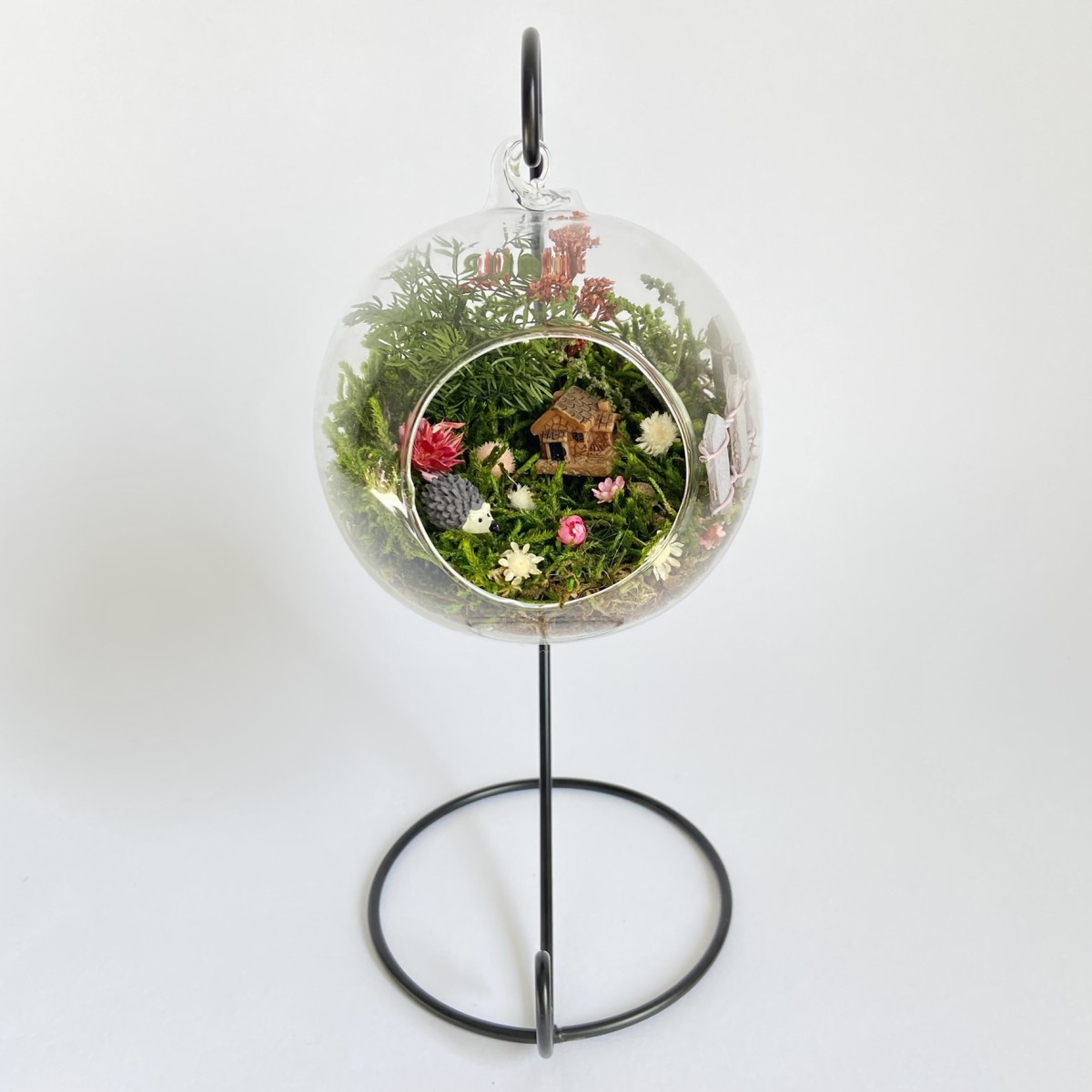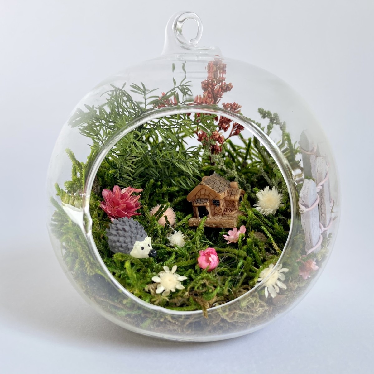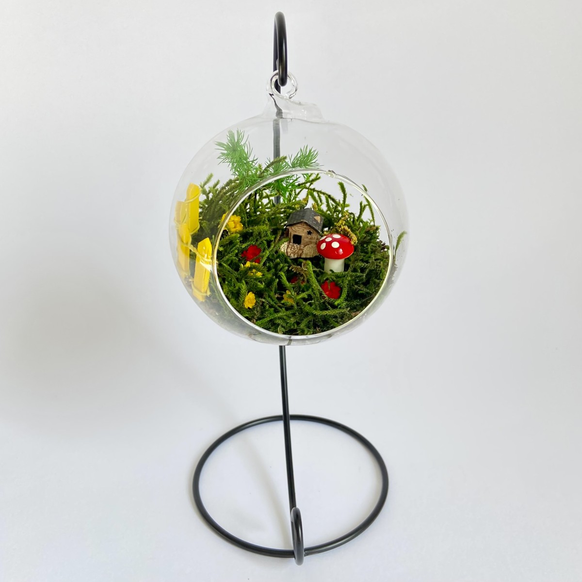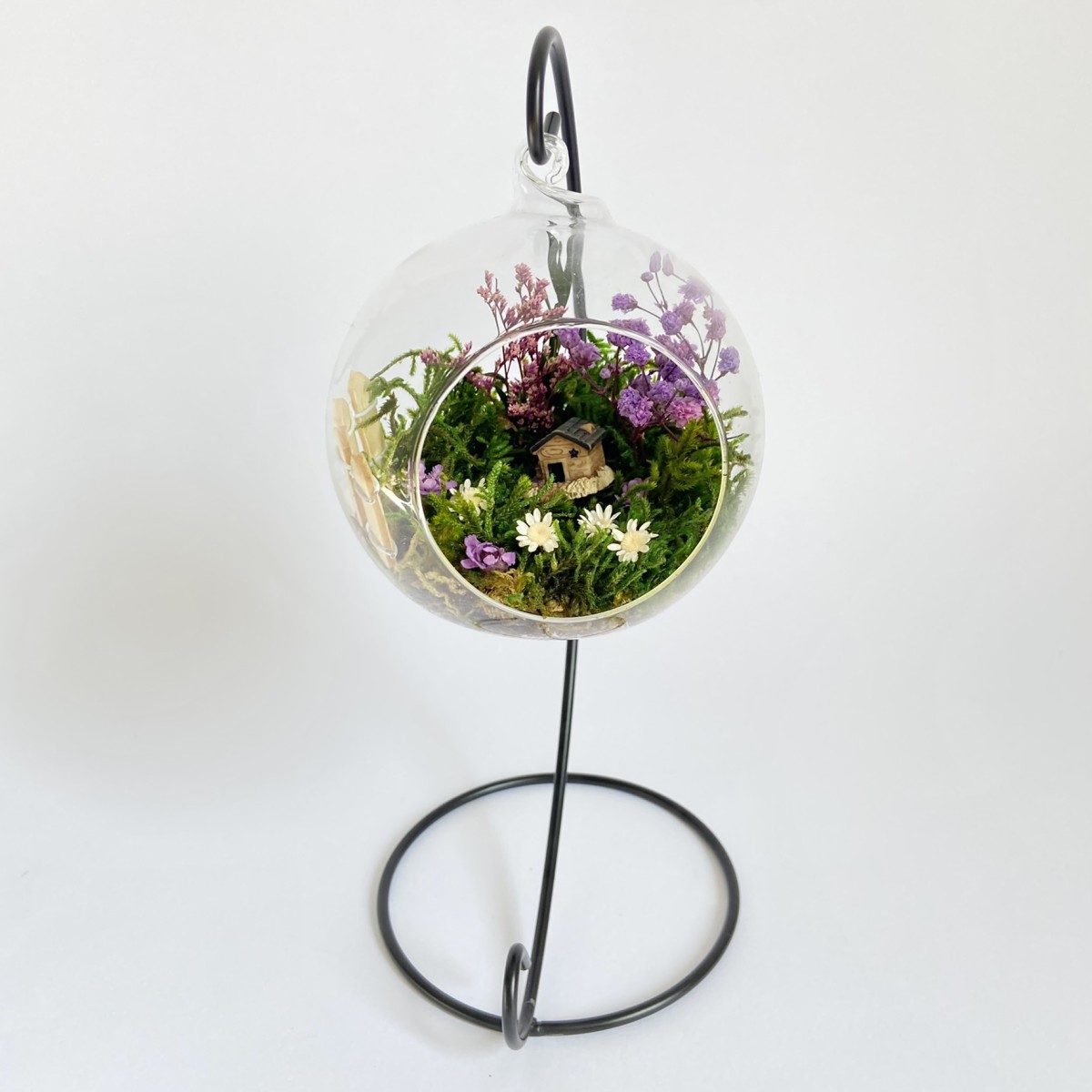 Peisajul din interiorul globului este realizat cu elemente naturale, muschi, plante si flori stabilizate si uscate si figurine din rasina. Plantele nu necesita in grijire si nu se deterioreaza, deoarece isi pastreaza culoarea si forma pentru o perioada de aproximativ 3-5 ani.