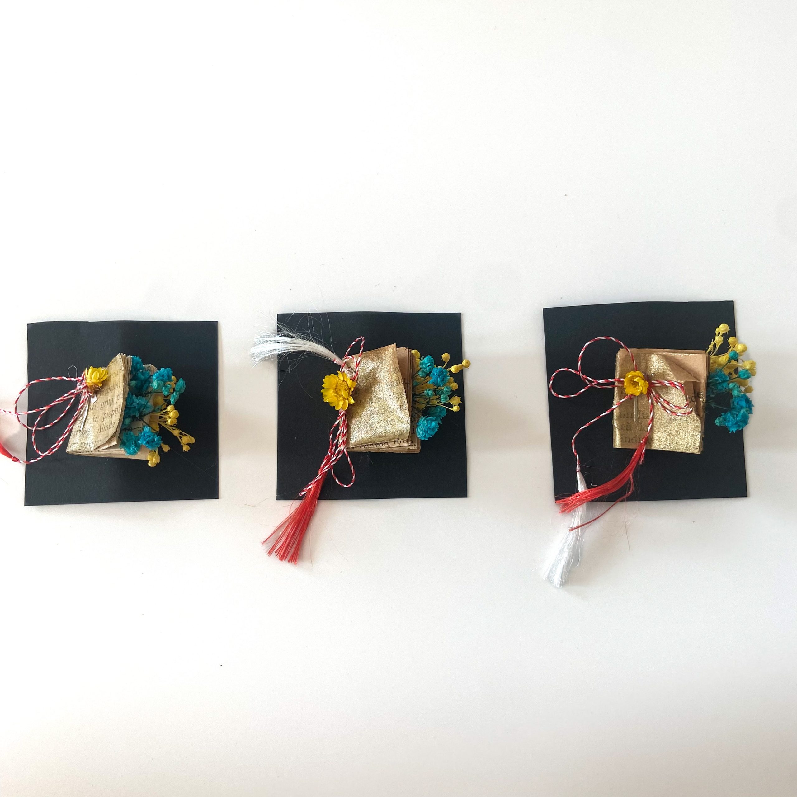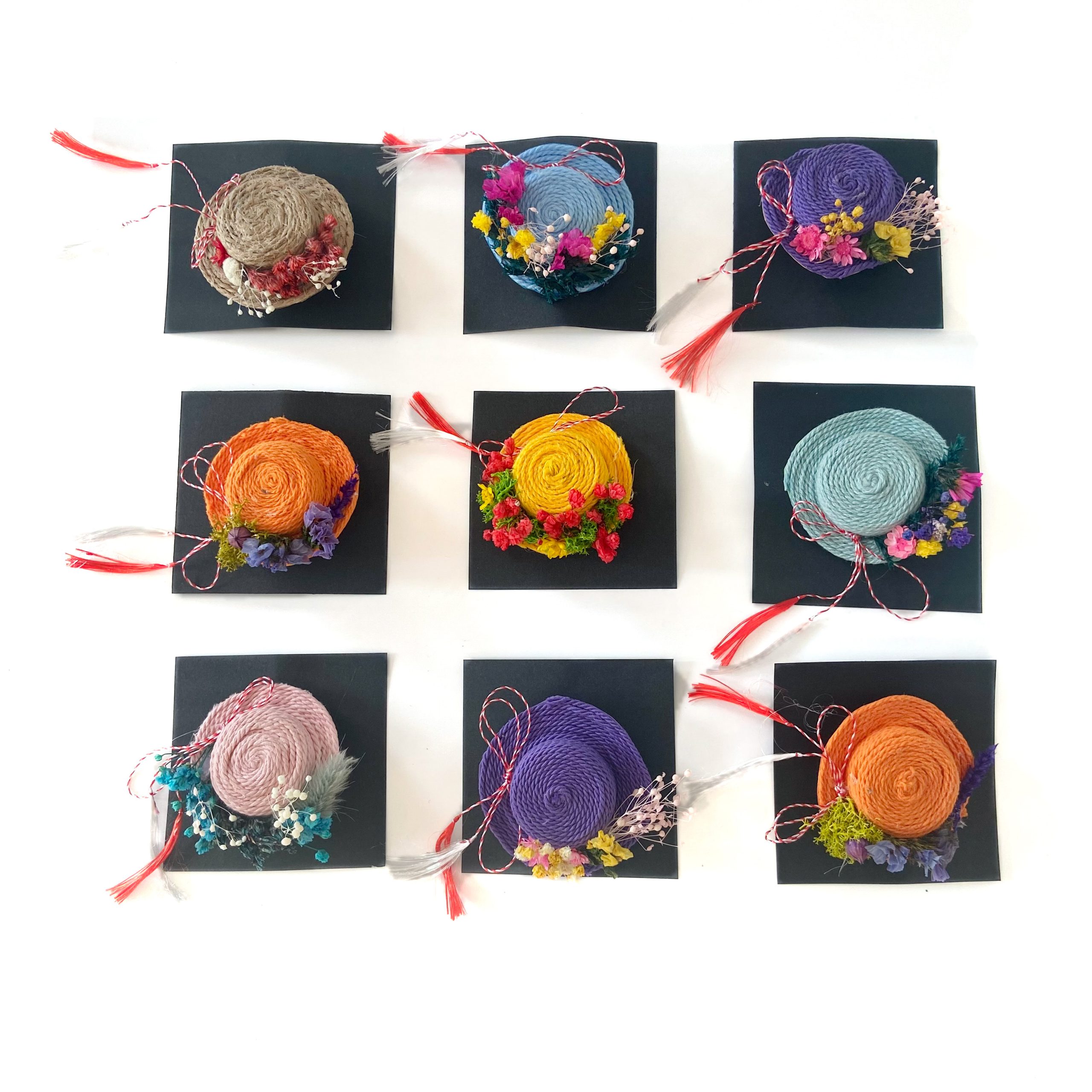 Ghivecele in miniatura, care sunt realizate manual, contin boboci de plante suculente si sunt decorate cu licheni colorati si fluturasi de lemn.