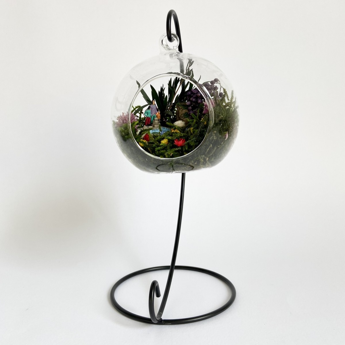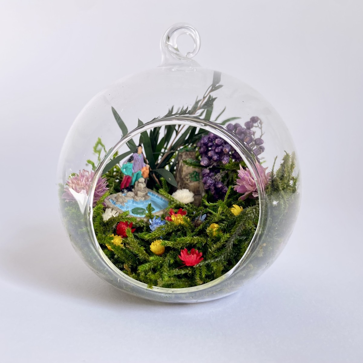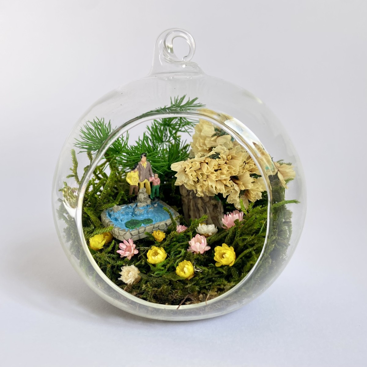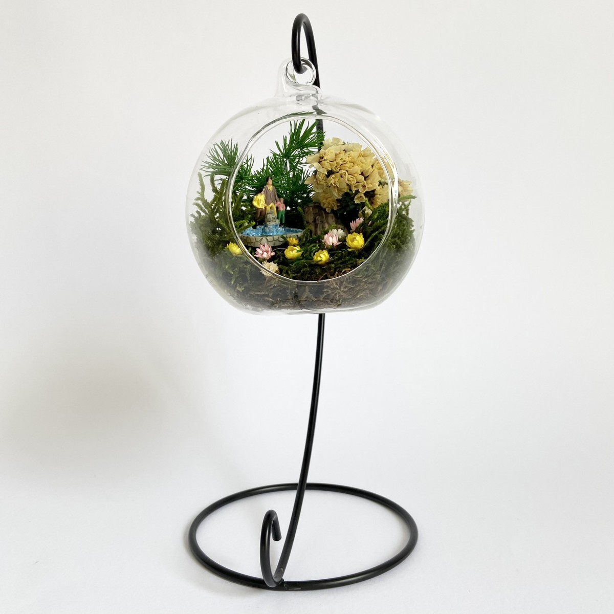 Peisajul din interiorul globului este realizat cu elemente naturale, muschi, plante si flori stabilizate si uscate si figurine din rasina. Plantele nu necesita in grijire si nu se deterioreaza, deoarece isi pastreaza culoarea si forma pentru o perioada de aproximativ 3-5 ani.