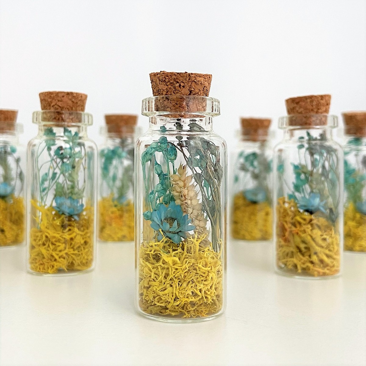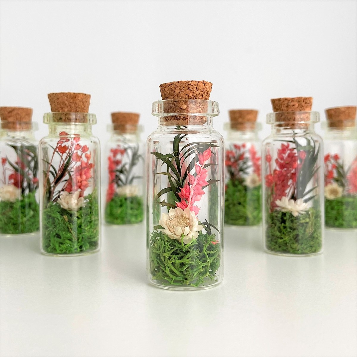 Sticlutele sunt reaizate cu licheni, plante si flori uscate sau stabilizate. Toate sticlutele au snur si mesaj.