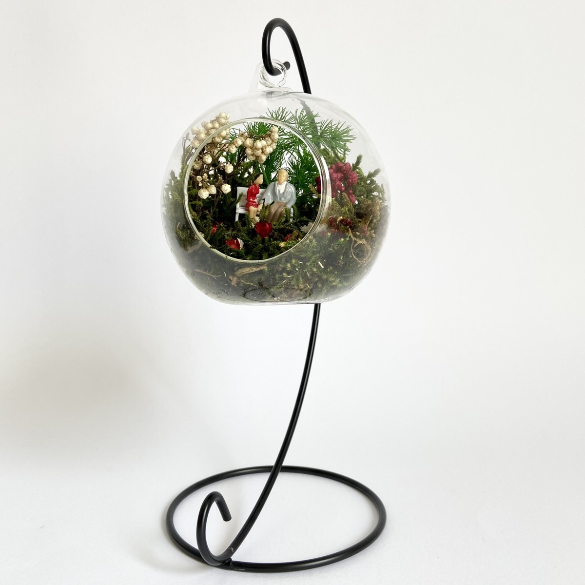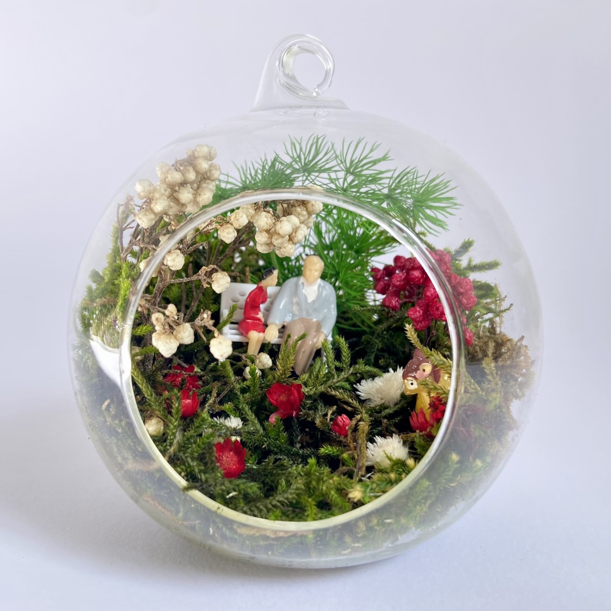 Peisajul din interiorul globului este realizat cu elemente naturale, muschi, plante si flori stabilizate si uscate si figurine din rasina. Plantele nu necesita in grijire si nu se deterioreaza, deoarece isi pastreaza culoarea si forma pentru o perioada de aproximativ 3-5 ani.